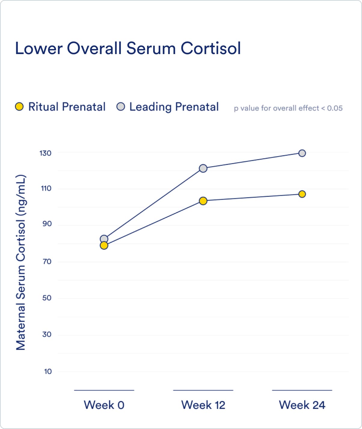 Moms taking Ritual had a lower overall cortisol level during pregnancy than those taking a leading prenatal.†*